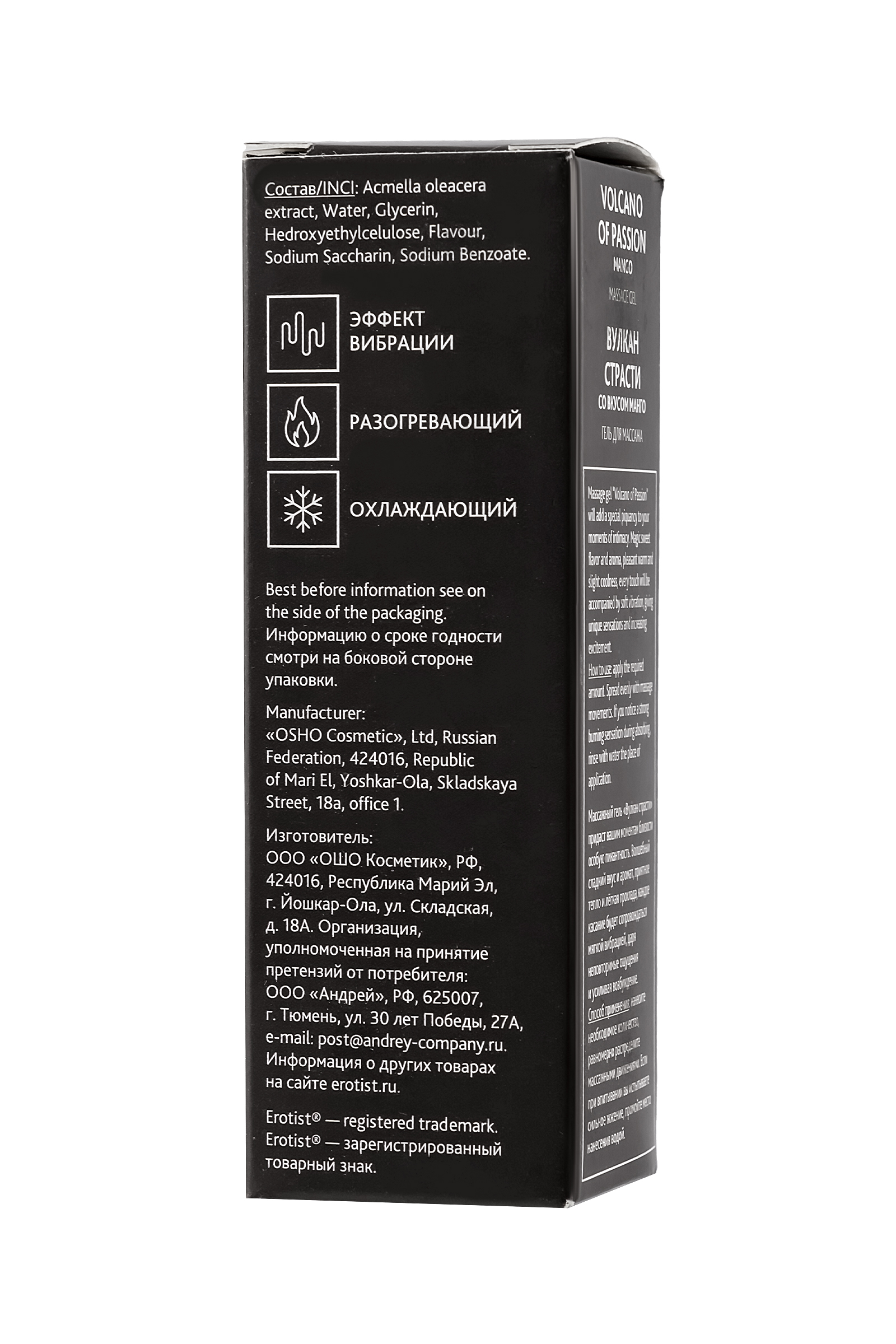 Массажный гель Эротист «Вулкан страсти» придаст вашим моментам близости особую пикантность. Волшебный сладкий вкус и аромат, приятное тепло и лёгкая прохлада, каждое касание будет сопровождаться мягкой вибрацией, даря неповторимые ощущения и усиливая возбуждение. Нанесите немного жидкого геля на интимные зоны, и через несколько секунд вы почувствуете тепло, затем в течение 2-3 минут легкую вибрацию и легкий холодок. Длительность эффекта зависит от особенностей вашего организма. Гель с вибрирующим эффектом для интимных зон На основе натуральных ингредиентов, без парабенов Вкус и аромат манго Подходит для поцелуев и орального секса Способ применения: нанесите небольшое количество геля на кончики пальцев и коснитесь клитора и вагинальных губ, массируя. Для наружного применения.