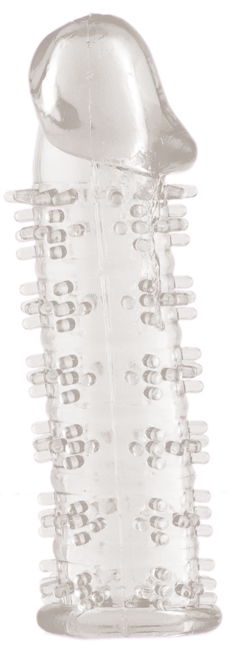 Насадка гелевая прозрачная ,в форме пениса с закрытой головкой покрытая по всей длине мягкими шипиками для внутренней стимуляции влагалища , легко одевается используется со смазкой для лучшего скольжения. увеличивает размеры пениса . Длина 12 см, ширина/диаметр 3 см. Материал ПВХ