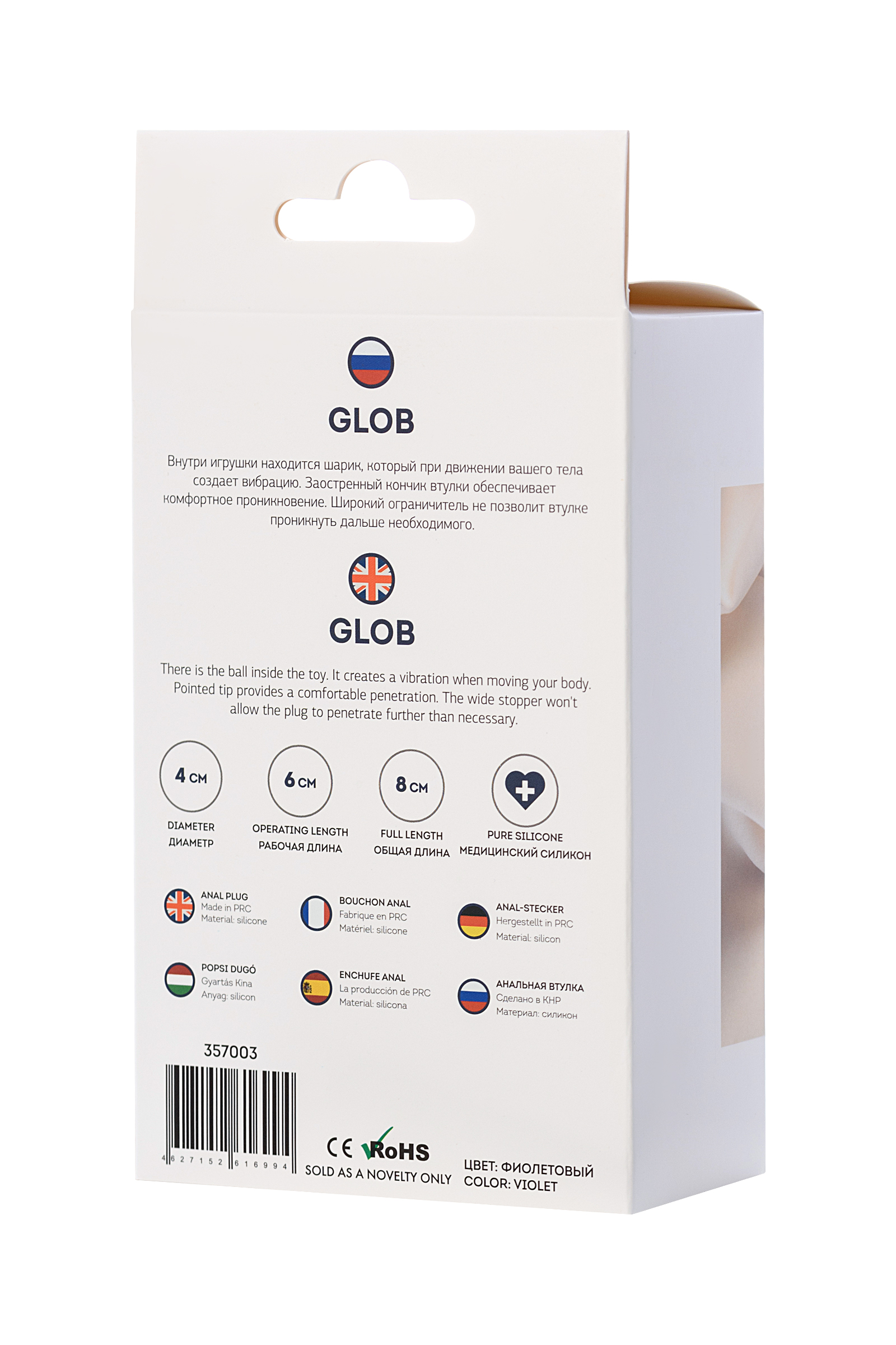 Glob Внутри игрушки находится шарик, который при движении вашего тела создает вибрацию. Заостренный кончик втулки обеспечивает комфортное проникновение. Широкий ограничитель не позволит втулке проникнуть дальше необходимого.Рекомендуем использовать до и после применения - дезинфицирующее средство для игрушки, чтобы обеспечить длительное скольжение и комфорт интимных отношений, рекомендуем использовать смазку на водной основе. Хранить при температуре не выше 35 градусов, избегать попадания прямых солнечных лучей.