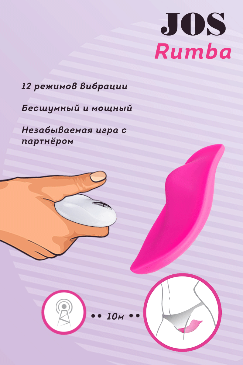 RUMBA от бренда Джос -клиторальный вибратор в трусики Тысячи сценариев флирта с наслаждением вы сможете разыграть с RUMBA. Просто поместите игрушку в трусики и отдайте пульт своему партнеру. Дома, в гостях, в ресторане или в клубе - вы сможете получить тайное наслаждение от взаимодействия друг с другом. Горошинка на кончике будет интенсивно стимулировать клитор. Изготовлен из высококачественного бархатистого силикона. Заряжается от USB. -12 режимов вибрации Бархатистый силикон Пульт дистанционного управления Рекомендуем использовать до и после применения - дезинфицирующее средство для игрушки чтобы обеспечить длительное скольжение и комфорт интимных отношений, рекомендуем использовать смазку на водной основе. Хранить при температуре не выше 35 градусов, избегать попадания прямых солнечных лучей. Перед хранением стимулятор необходимо хорошо просушить