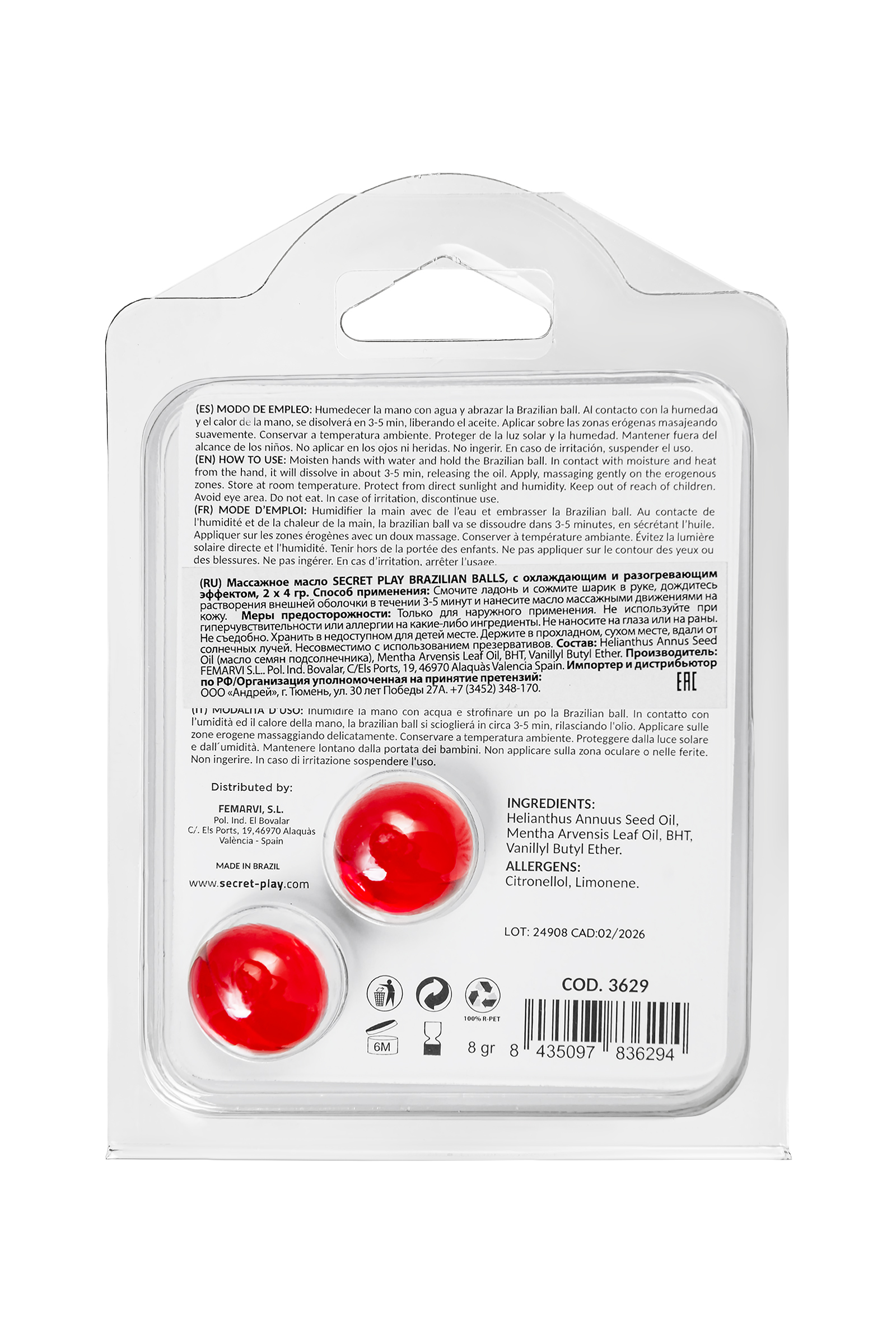 Бразильские шарики с горячим и холодным эффектом — это уникальное сочетание, которое подарит незабываемые ощущения контрастной игры температур. Эти шарики от Secret Play разработаны для тех, кто хочет испытать страстное сочетание тепла и прохлады, усиливающее чувственные моменты и добавляющее разнообразие в прелюдию. Дайте волю своим желаниям и откройте для себя новую палитру удовольствий. Просто смочите руку водой и обнимите ладонью шарик, чтобы начать его таяние. Через 3–5 минут он растворится, выпуская массажное масло, которое дарит одновременно согревающее и освежающее ощущение. Эффект сочетания тепла и прохлады делает каждое прикосновение более острым, возбуждающим и незабываемым. Подарите себе и своему партнёру контрастное наслаждение с бразильскими шариками, которые разжигают страсть и дарят моменты неповторимого удовольствия! Горячий и холодный эффект создает контрастные ощущения, усиливающие чувственные удовольствия Идеально подходит для массажа, прелюдии и новых экспериментов Ароматный, стимулирующий эффект дарит ощущение страсти и игривости Прост в использовании и идеально подходит для того, чтобы внести новое измерение в интимные моменты 2 бразильских шарика по 4 грамма каждый Внешний слой — вода, внутренняя жидкость — масло Несовместимо с использованием презервативов Состав: Масло семян Helianthus Annus, масло листьев Mentha Arvensis, BHT, ванилилбутиловый эфир. Способ применения: Смочите руку водой и обнимите ладонью бразильский шарик, чтобы начать процесс растворения. Подождите 3–5 минут, пока шарик полностью не растает, выпуская масло. Нанесите его на эрогенные зоны легкими массирующими движениями и наслаждайтесь контрастными ощущениями тепла и прохлады. Меры предосторожности: Хранить при комнатной температуре, избегая прямых солнечных лучей и влажности. Не наносить на область глаз или поврежденную кожу. Не глотать и хранить в недоступном для детей месте. Прекратить использование при появлении раздражения. Несовместимо с использованием презервативов.
