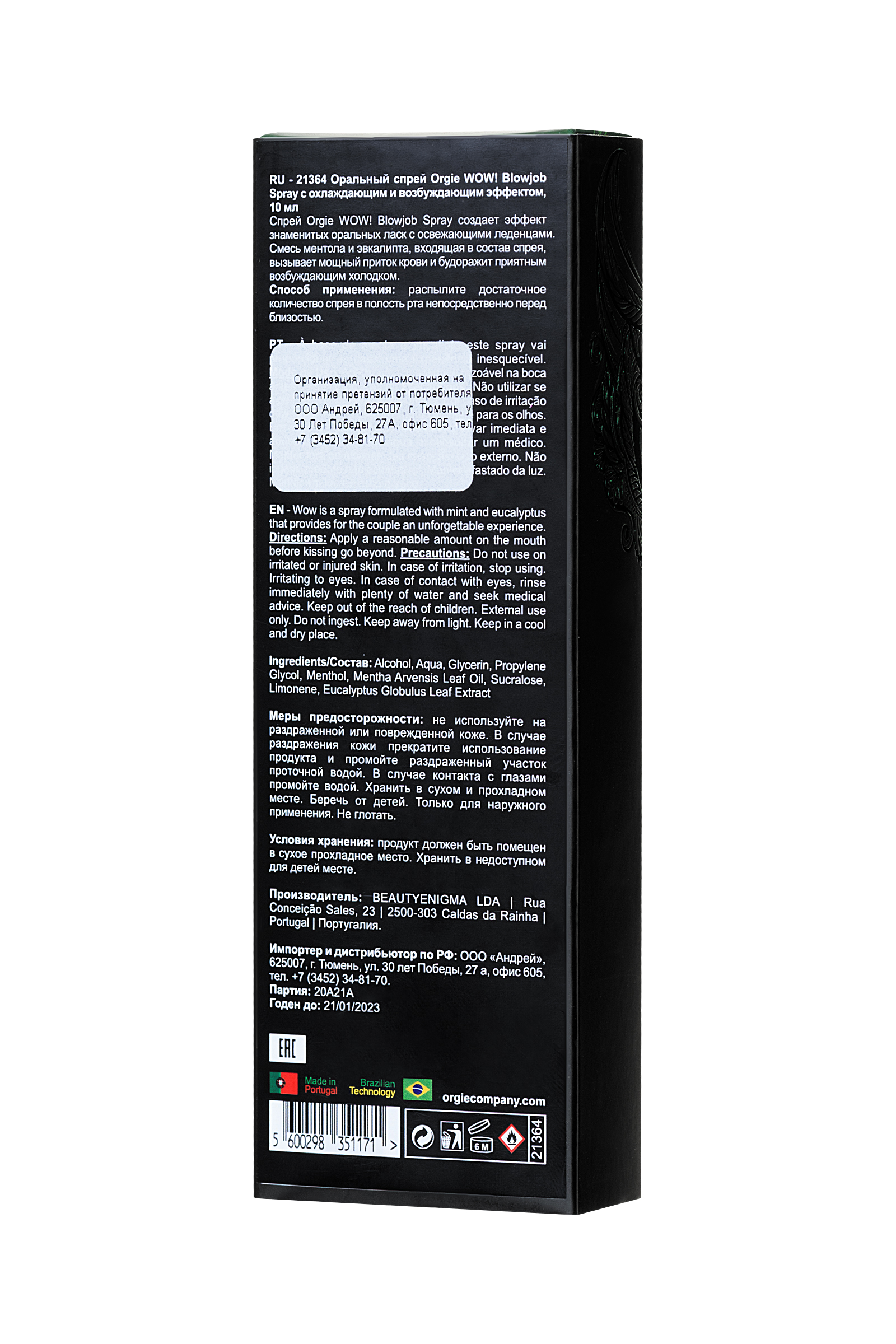 Спрей Орджи WOW! Blowjob Spray создает эффект знаменитых оральных ласк с освежающими леденцами. Смесь ментола и эвкалипта, входящая в состав спрея, вызывает мощный приток крови и будоражит приятным возбуждающим холодком. Способ применения: распылите достаточное количество спрея в полость рта непосредственно перед близостью.