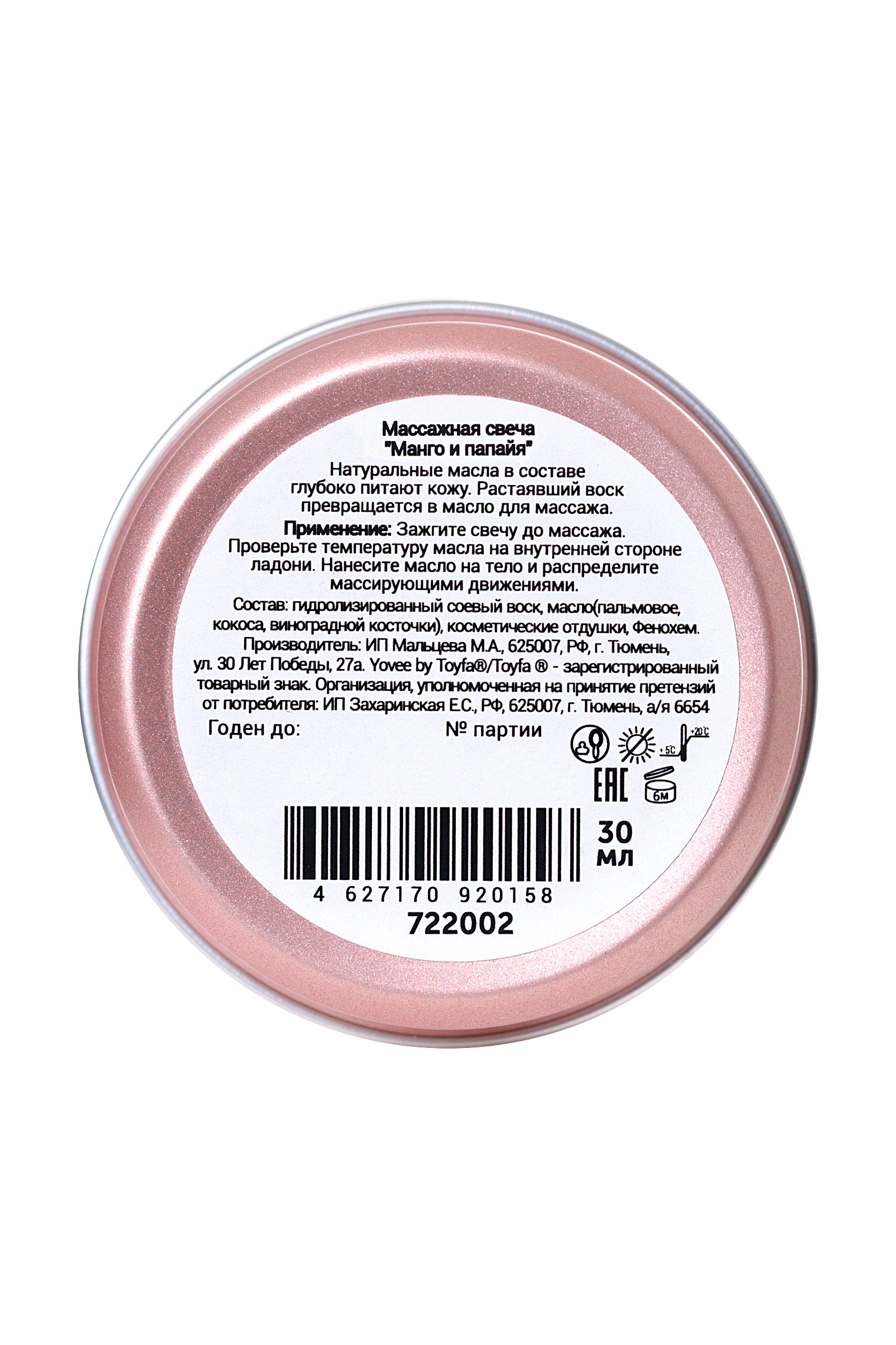 Свеча массажная Ёви «Массаж на пляже» с ароматом манго и папайи Натуральные масла в составе глубоко питают и увлажняют кожу. Растаявший воск превращается в масло для массажа. Свеча станет идеальным аксессуаром для романтического свидания.Идея для свидания: Приготовьте фруктовую тарелку и предложите партнеру окунуться в атмосферу отпуска. Зажгите массажную свечу. Предложите партнеру расслабиться в ожидании массажа. Погасите свечу и немного подождите, пока масло остынет. Лейте масло вдоль спины медленно, а затем начните с лёгких массирующих движений. Сделайте массаж своим обнаженным телом — так он станет ещё более интимным и чувственным. Такое свидание останется в памяти надолго!Свеча подарит незабываемые ощущения, после которых вам гарантированы нежные и мягкие прикосновения!Применение: Зажгите свечу до массажа. Когда образуется достаточное количество масла, погасите её. Проверьте температуру масла на внутренней стороне ладони, при необходимости дайте маслу немного остыть. Нанесите разогретое масло на тело и массирующими движениями распределите по телу.